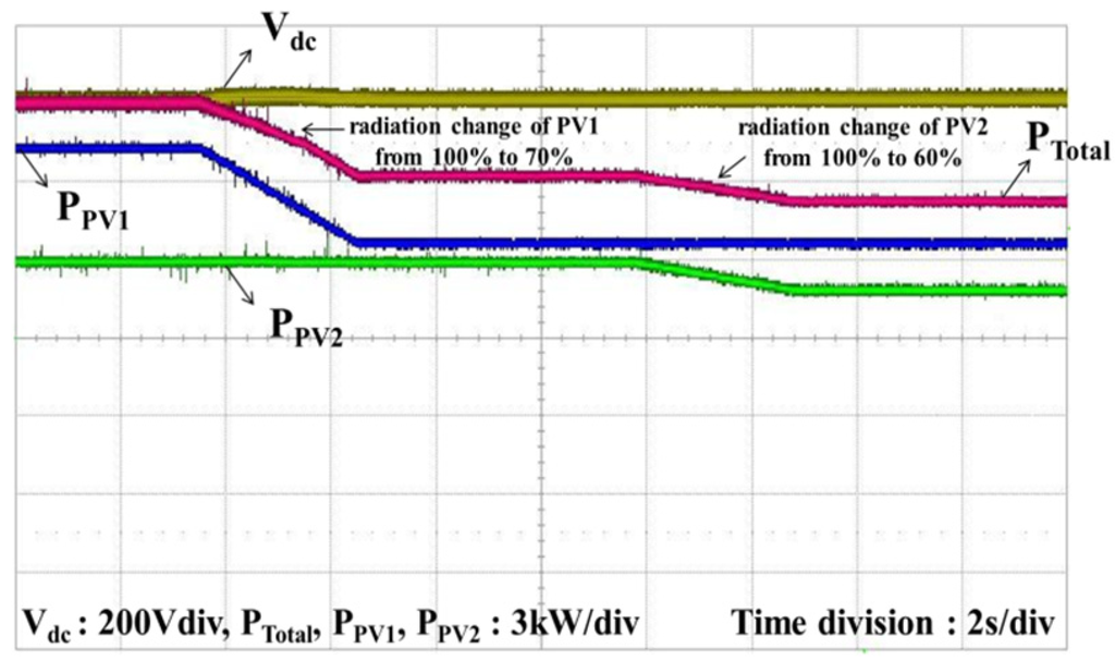 Figure 22 and Figure 23 show the powers waveforms when the radiation is altered. In Figure 22, the radiation of PV1 is changed from 100% to 70%, and the radiation of PV2 is changed from 100% to 60%. The radiation of PV1 is changed from 70% to 100% and the radiation of PV2 is changed from 60% to 100% in Figure 23. The change in radiation does not cause the voltage of the PV cells to increase. Therefore, the DC-link voltage also remains unchanged. The total power changes, however, because the PV powers are increased or decreased. In this case, the maximum power point tracking is well conducted by the MPPT algorithm and is shown in Figure 24.