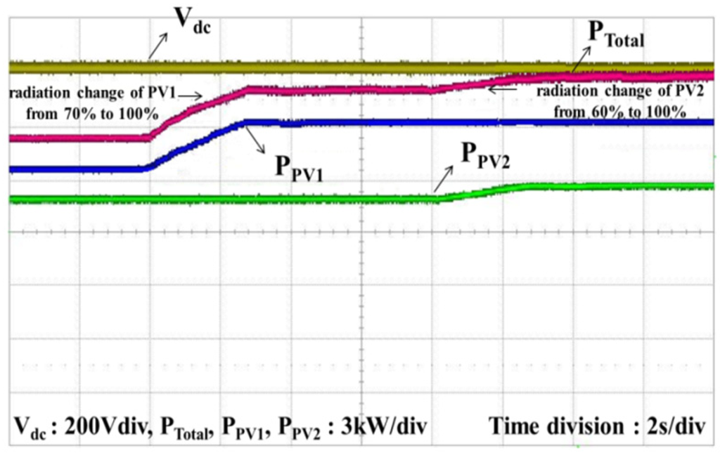 The rated powers of the string 1 and string 2 boost converters are 7 kW and 3 kW. The rated power of the inverter is 10 kW. Most of the system parameters are the same as those used in the simulations: two input inductances of the boost converters are 1.5 mH, the capacitance of the DC-link capacitor is 1100 µF, and the inductance and capacitance of LC-filter parameters are 2 mH and 4.7 µF. The switching frequency for both the boost converter and the inverter is 20 kHz, and the three-phase grid uses a 380 V line-to-line voltage. However, ωn for the DC-link voltage controller is chosen to be 30 rad/s for system stability, and the ramp response of the DC-link reference voltage is 50 V/s. The calculation period for the MPPT algorithm is 0.5 s and Δduty-cycle is 0.005.