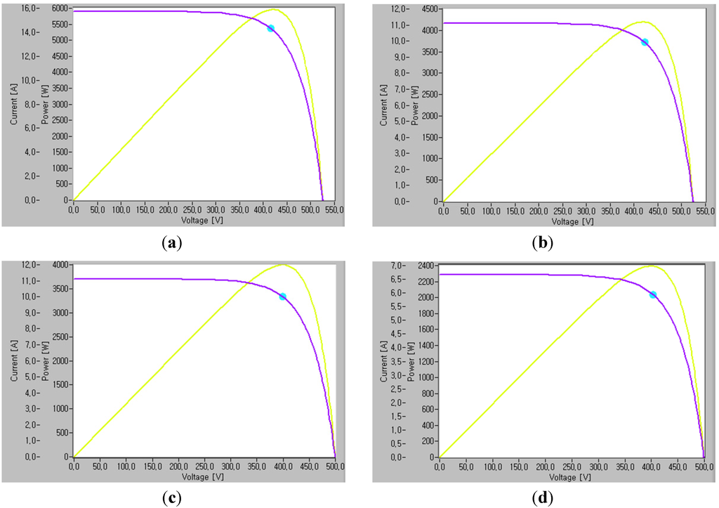 The MPPT algorithm is implemented in the boost converters. Each boost converter’s operation is reflected in each MPPT algorithm. The MPPT algorithm for each string calculates the duty-cycle of the boost converter using its voltage and current. Therefore, each MPPT algorithm is implemented independently on the associated strings.