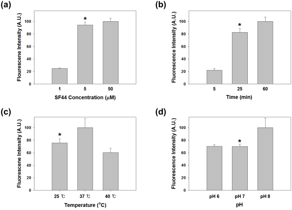 Effects of (a) dye concentration; (b) staining time; (c) temperature; and (d) pH on the staining of Chlamydomonas reinhardtii cells are shown. The optical density of the cell suspensions was 1.0 (OD680 nm). All data are expressed as the mean of 30 replicates with a single standard deviation. Asterisk indicates the optimal condition for staining SF44.