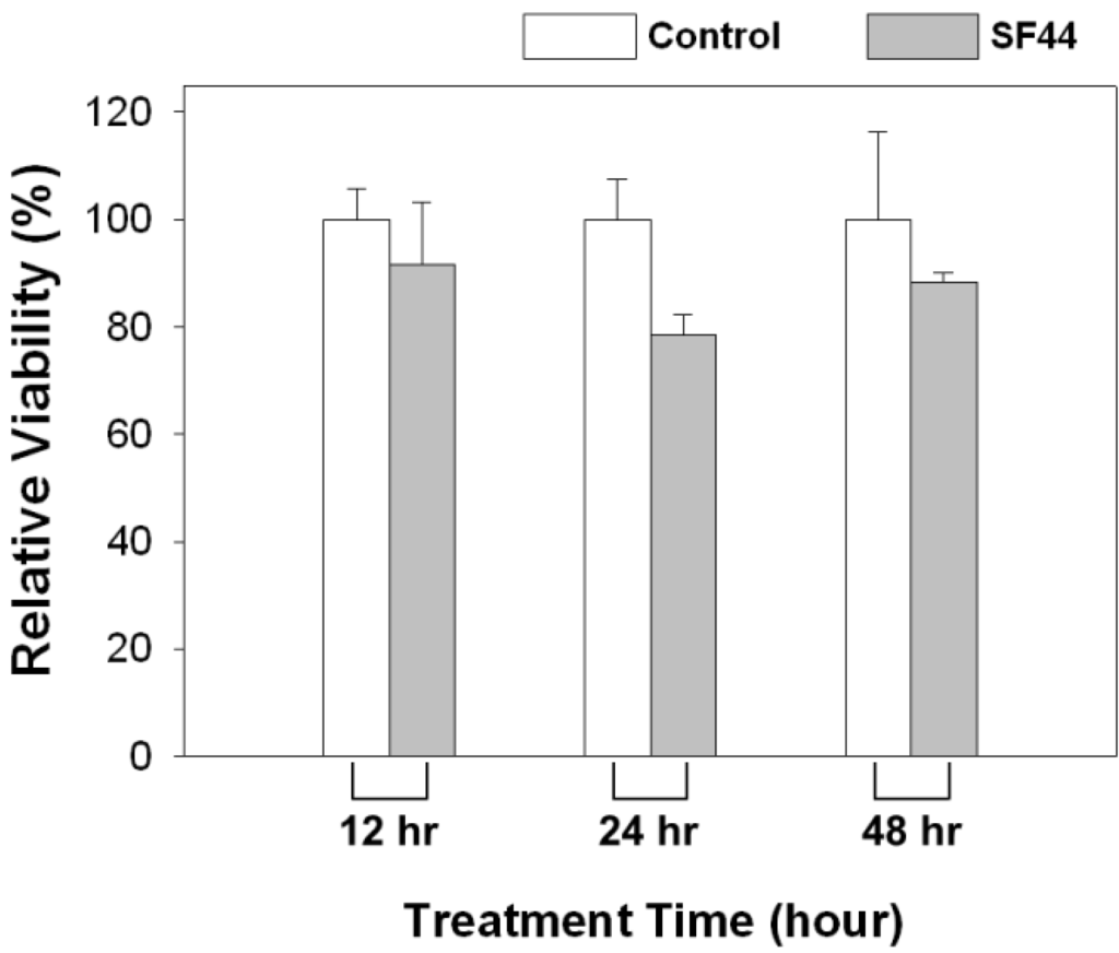 The viability of C. reinhardtii treated with SF44 (gray bar) and control (white bar) is shown with treatment of 12, 24, and 48 h.