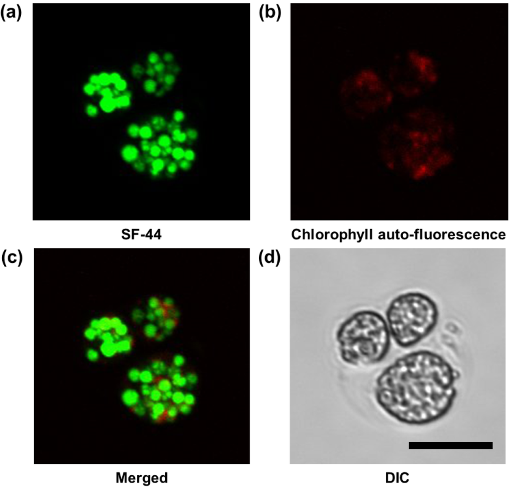 Micrographs showing (a) the fluorescence of LDs stained by SF44 (in green); (b) chlorophyll auto-fluorescence (in red); (c) the merged fluorescence SF44 and chlorophyll auto-fluorescence; and (d) a DIC image. All images were acquired through a confocal microscope (FV1000). The scale bar represents 10 μm.