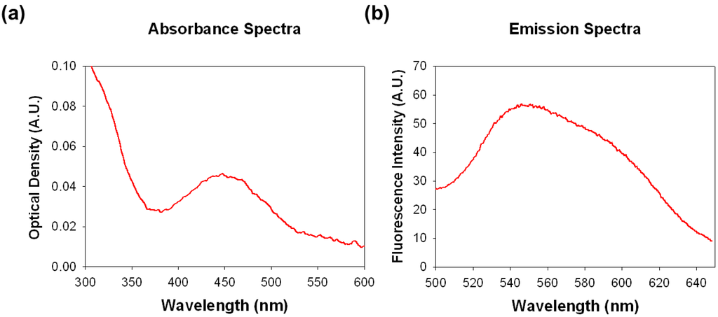 Fluorescence characteristics of SF44. (a) Absorbance and (b) emission spectra are shown for SF44 with 1 mg/mL of phosphatidylcholine (PC) liposome. Absorbance and emission wavelength were 450 nm and 540 nm, respectively.