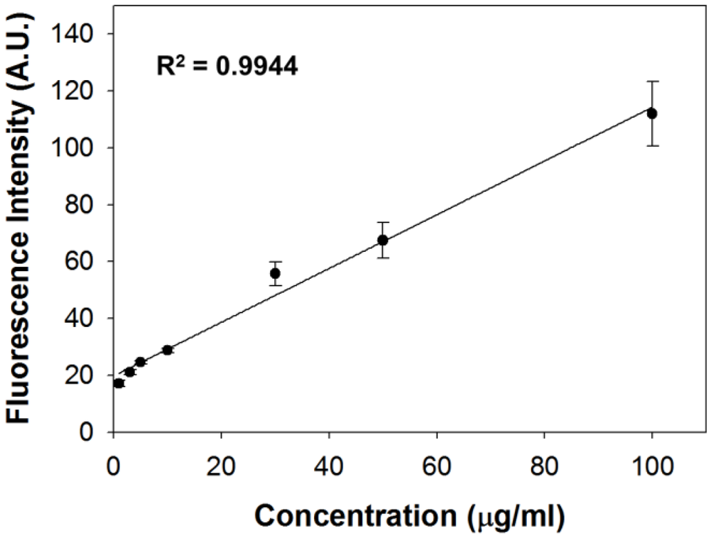 As an alternative, we used a spectrofluorimeter to monitor SF44 stained LD quantitatively at 540 nm with excitation at 450 nm (Figure 4). We prepared liposomes as model LDs using mechanical dispersion methods. Phosphatidylcholine (PC) liposomes were prepared at various concentrations ranging from 1 μg/mL to 100 μg/mL by diluting a stock solution. Fluorescence intensities were measured at each concentration. Figure 5 shows a linear (R2 = 0.9944) standard curve acquired by plotting fluorescence intensity as a function of liposome concentration. This approach shows the possibility of indirect measurement for lipid content using a spectrofluorimeter.
