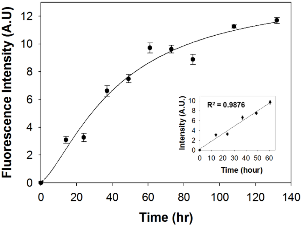 Based on correlation between concentration of PC liposome and fluorescence intensity after SF44 staining, we confirmed that fluorescence intensity can be used to track the kinetics of intracellular lipid accumulation with N-source-starved C. reinhardtii. Figure 6 shows the fluorescence intensity associated with LD accumulation as a function of time. Fluorescence intensity was monitored at 540 nm with excitation at 450 nm. From the onset of the experiment to 60 h, the LDs concentration increased linearly as a function of time (R2 = 0.9876). No further increase in LDs concentration was observed after 3 days of incubation.