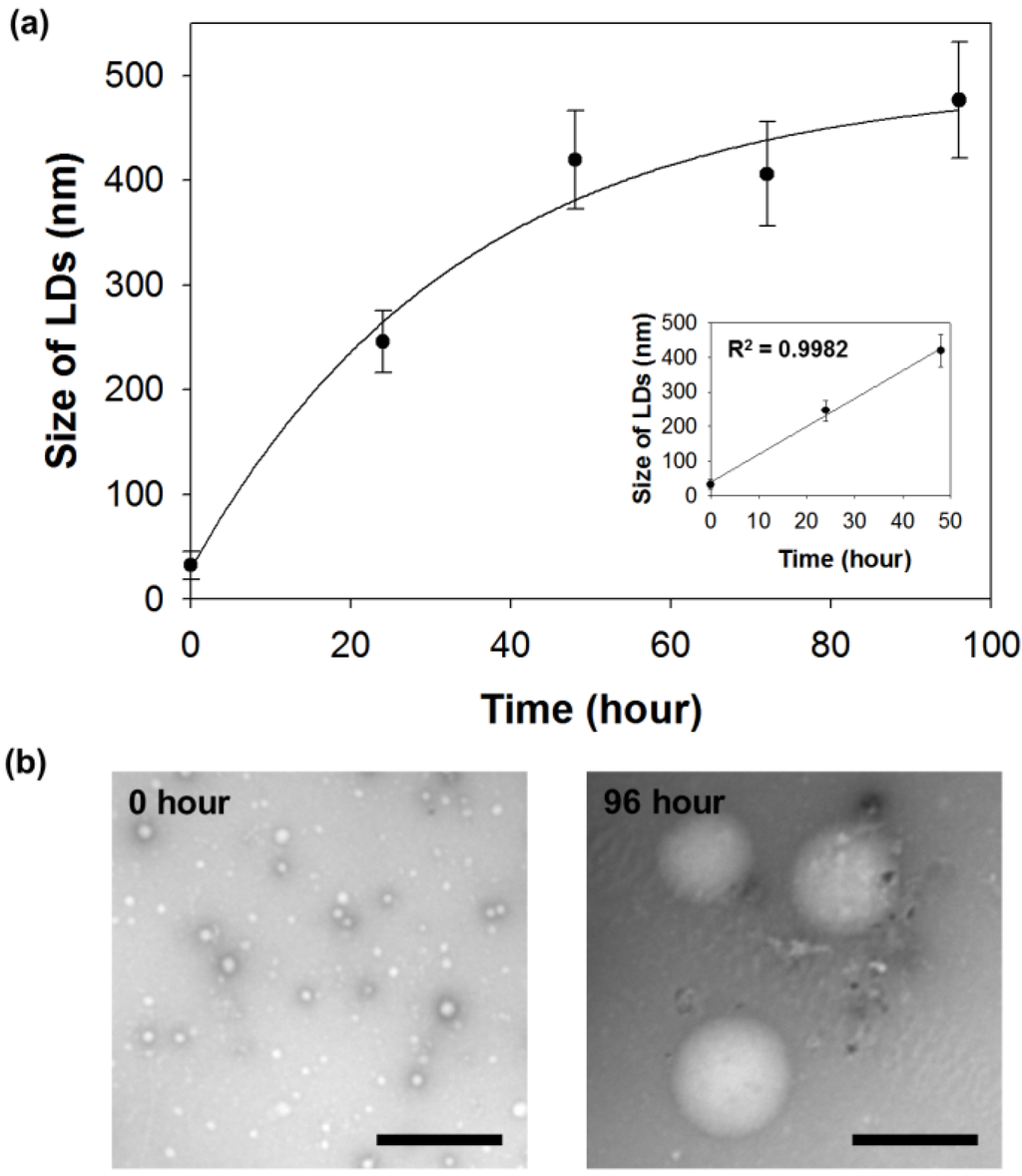 To validate the fluorescence-based indirect measurement for LD accumulation, we measured the size of purified LDs and verified the kinetics. Figure 7 shows the size measurement (from TEM imaging of LD) associated with LDs accumulation. From the onset of the experiment to 48 h, the size of LDs increased linearly as a function of time (R2 = 0.9982). Like with fluorescence-based indirect measurements, no further increase in size of LDs was observed after 3 days of incubation.