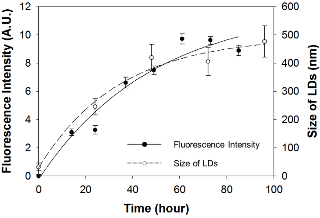 Accumulation kinetics of intracellular LDs. The fluorescence intensity of SF44 was monitored with a spectrofluorimeter (closed dot and line). The size of purified LDs was determined using TEM micrograph (open dot and dashed line).