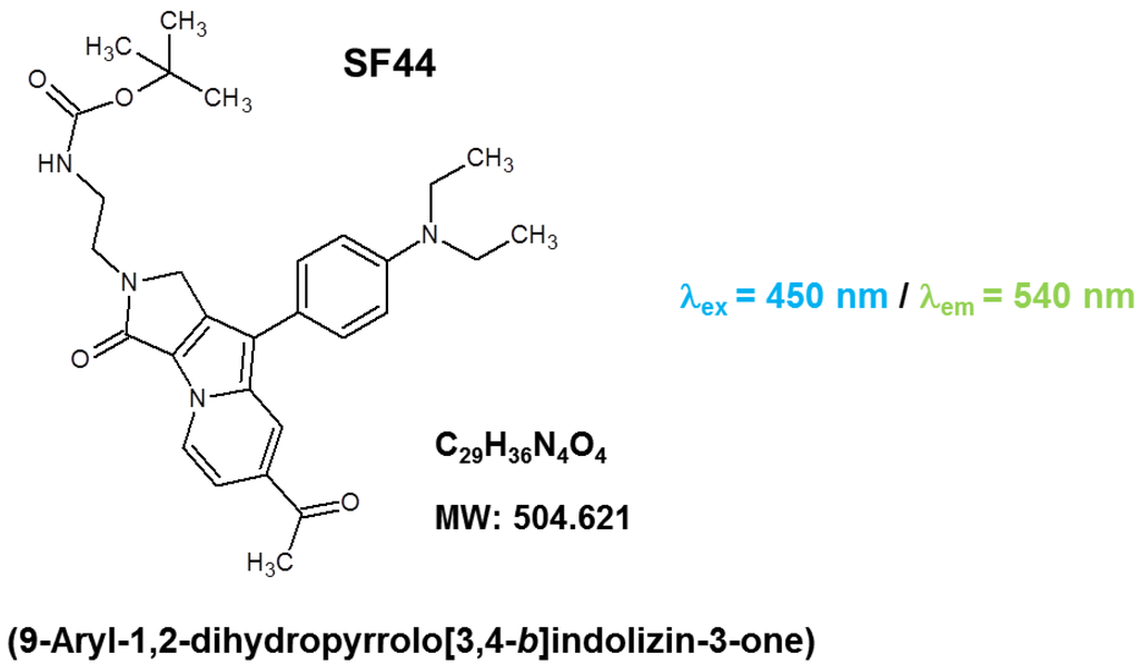 In this study, we introduced a new LD-specific fluorescence probe; SF44. 9-Aryl-1,2-dihydropyrrolo[3,4-b]indolizin-3-one, named Seoul-Fluor (SF), is a tunable and predictable fluorescent core skeleton. (Scheme 1) SF44 and various analogues containing electron-donating amine moieties have been introduced as a LD-specific fluorescence bioprobes in mammalian cells [] and microorganisms []. SF44 has been successfully applied to the specific measurement of LD organelles using its fluorogenic properties under unique hydrophobic environment of LDs in cytosols []. SF44-based LD staining does not require any washing and fixation steps to acquire fluorescence signals as same with conventional Nile Red method. Therefore, SF44 can be considered a powerful tool for developing algal bioprocesses and for optimizing quantitative, high-throughput screening.
