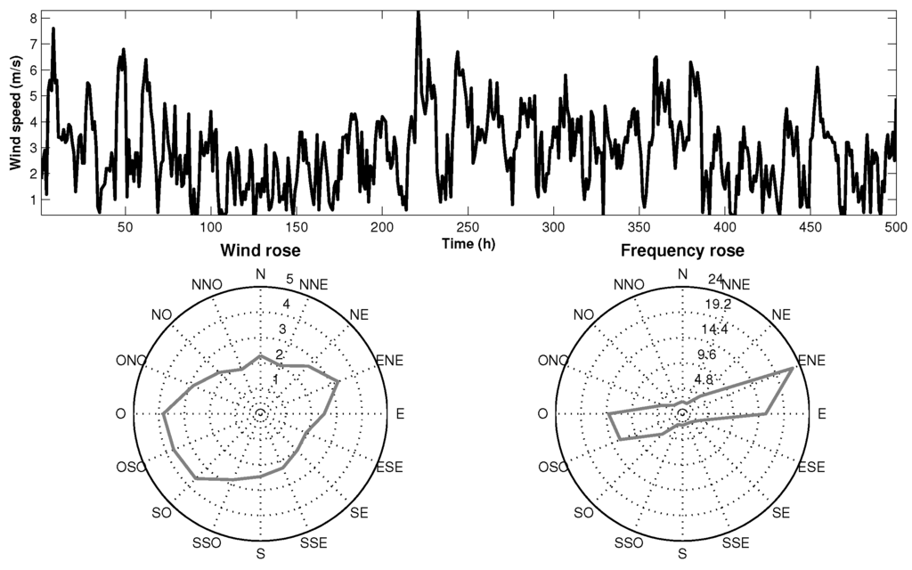 Figure 1 shows the wind singularities at the target station through a wind speed graph, and the frequency and speed rose (only 500 records are displayed for better visualization).