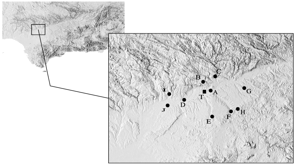 To improve predictions, the ten closest stations have been selected within a radius of 40 km, and initially conceived to measure agriculture variables (Andalusian agriculture-climate information network [26]), providing hourly measurements. Wind records are not reliable enough, because most of them are located in the open air, being highly affected by obstacles (the anemometer’s height is 2 m).