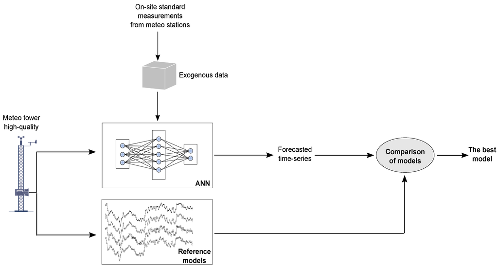 This paper describes short-term wind speed forecasting techniques based on various soft computing models. The value of the present research resides in the use of exogenous data from standard on-site measurement stations to improve prediction. This procedure is depicted in Figure 3.
