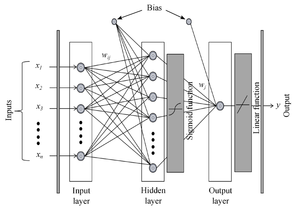 - Multilayer ANNs, shown in Figure 4, based on error backpropagation, are the most widely used method [31,32]. The network is a dynamical system that changes with the learning rule, which sequentially finds the weights that codify the knowledge. The network will then have a generalization capability that must be measured. The Levenberg-Marquardt algorithm has been chosen, minimizing the mean squared error (MSE) of the difference between the output in each step.