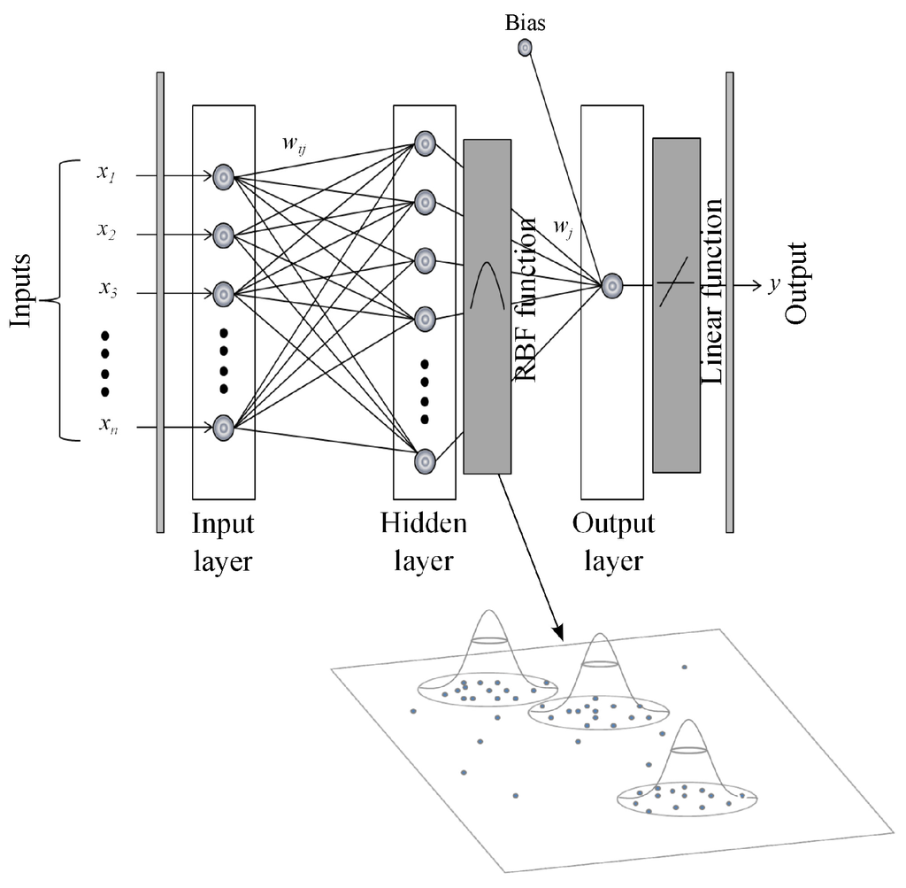 - Radial basis function (RBF) networks have similar forms to that of a two-layer multilayer network (Figure 5) [33]. The fundamental difference arises in the hidden neurons and operates on the distance between an input with respect to the synaptic vector (called a centroid). The RBF neurons comprise a localized response, because they only respond with an appreciable intensity when presented with an input vector and the centroid of the neuron belonging to a nearby area in the input space. RBF training is comprised of two stages: the first is unsupervised and accomplished by obtaining cluster centers of the training set inputs; and the second one consists of solving linear equations.