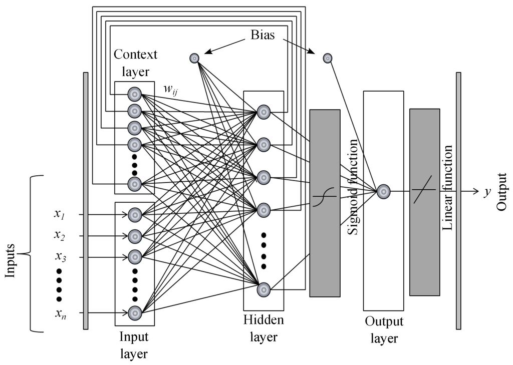 - The Elman neural network is characterized by feedback from the hidden layer output to the first-layer input, which constitutes the context layer that retains information between observations [9,29,34]. This recurrent connection allows the Elman network to detect and generate time-varying patterns (Figure 6).