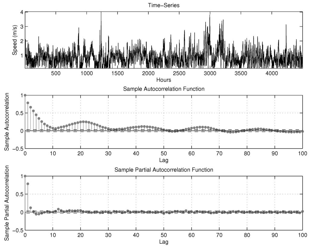 Time series wind speed, autocorrelation function (ACF) and partial autocorrelation function (PACF) plots at Peñaflor.