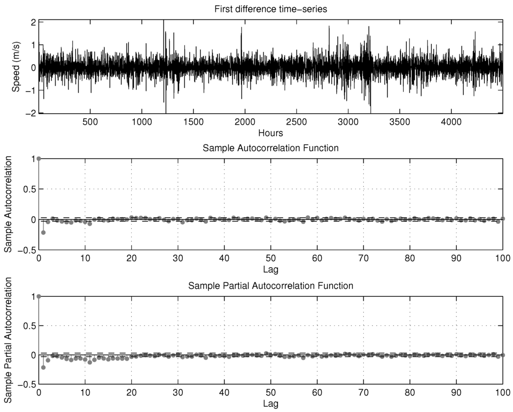 The implementation of the persistence model does not present any problems. However, the ARIMA model needs preliminary actions to establish the order p, d and q which best fit the target time series. The Box-Jenkins methodology is adopted to identify these parameters. In the Box-Jenkins methodology, a differencing approach is used to stabilize the original data, and both an autocorrelation function (ACF) and a partial autocorrelation function (PACF) are utilized to decide the autoregressive or moving average component, which should be included in the ARIMA model. The choice of the appropriate values of the model is based on the ACF and PACF characteristics shown in Table 3. With this goal, the autocorrelation coefficients and the partial autocorrelation coefficients are evaluated and depicted in Figure 8.