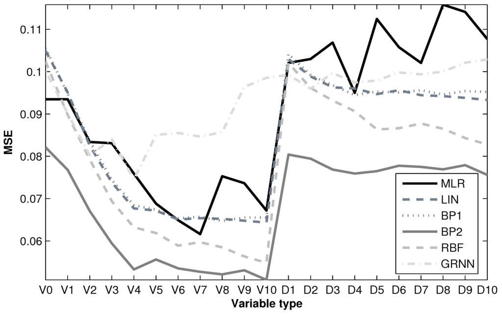 Table 8 shows the results, in terms of MSE, obtained for each of the ten best models selected in Table 7. One hundred experiments were performed for statistical analysis. As illustrated in Table 8, the model, ExogVar, proves the robustness and capacity for enhancing the prediction errors of the reference models. This is confirmed by means of the statistical tests (ANOVA and Bonferroni’s test).