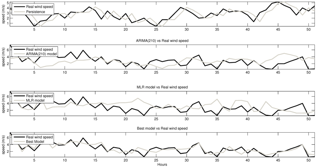 In the present case, the best model to perform 1 h-ahead prediction is a backpropagation network with one hidden layer and five neurons. This model uses six exogenous speed values and meaningfully improves the three witness models according to four quality indexes: ρ, IOA, MAE and MSE. The main enhancements are more visible in MAE, which achieves a value of 0.65 m/s, and MSE with 0.67 m/s. The percentages of improvement with respect to the reference models are 29.10% and 56.54% for the persistence, 28.15% and 53.99% for the ARIMA (2,1,0) and 4.93% and 14.38% for the MLR model.