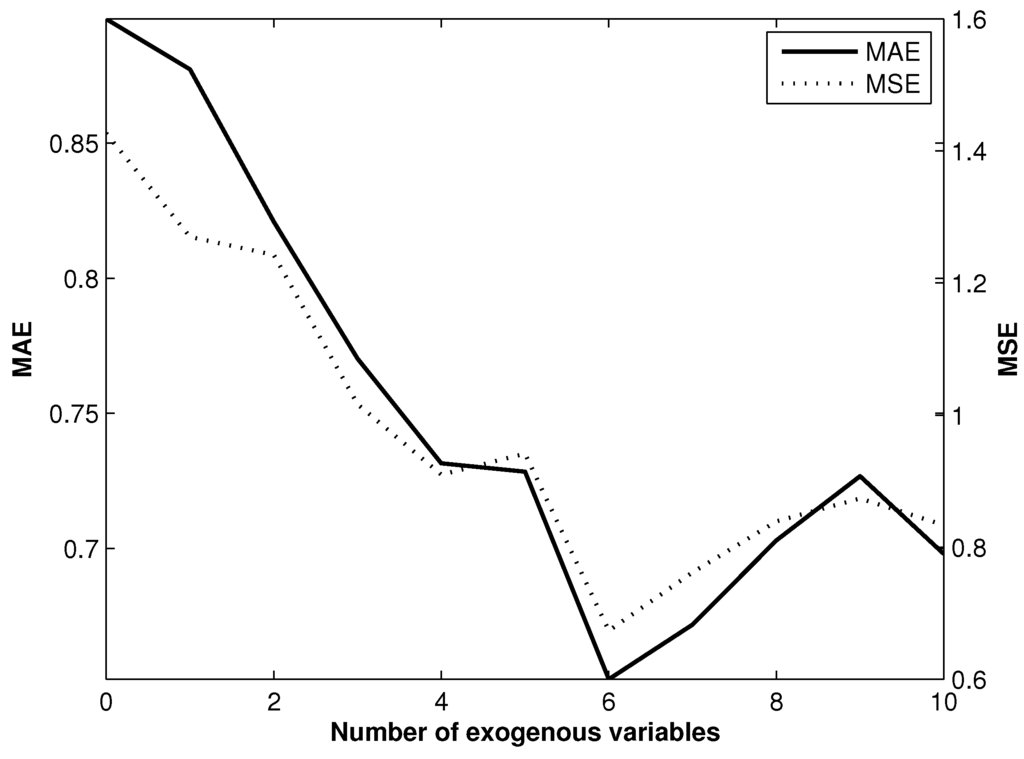 Evolutions of the mean absolute error (NAE) and mean squared error (MSE) errors obtained by the best model in the function of the exogenous variables used.