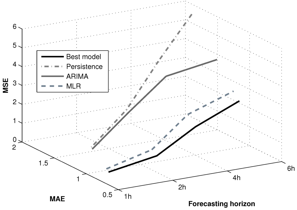 Finally, and to complete this study, the best architecture (BP1: five hidden neurons) is analyzed in the function of the forecasting horizon. The assessment is based on the forecasting horizons of 1, 2, 4 and 6 h. As Figure 14 shows, the MSE and MAE indexes get worse as the forecasting horizon progresses, although the best model still exceeds the three reference models.