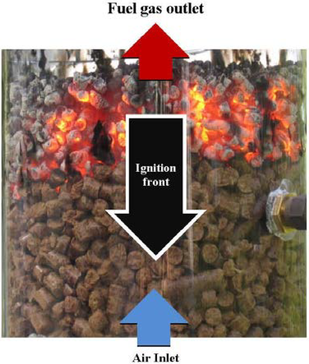 The combustor works as a batch reactor. During the experiment, the combustion is started by manual ignition at the top layer of the fuel, and the ignition propagation front advances downwards. Considering the air direction, the system is in a counter-current configuration [26]. In counter-current combustion models, the radiation (gas-particle and particle-particle) and heat-transfer (particle-particle) cause the ignition to propagate in the opposite direction of the air flow; however, convection complicates the propagation due to bed cooling [27].