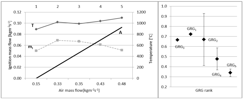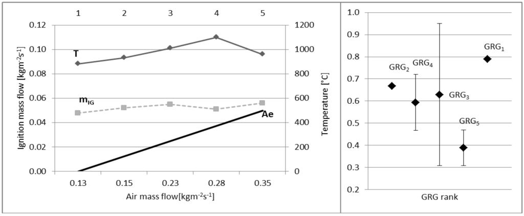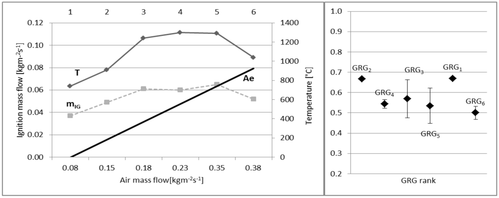 Once the GRG and GRGe are calculated for each data sequence, the results are plotted (Figure 6, Figure 7 and Figure 8, right-hand side). The order of the sequence that is shown in the GRG rank plots (right area of the plots) matches the one that was used to represent the effect of the air mass flow on the ignition mass flow and on the temperature in the ignition front (left area of the plots).