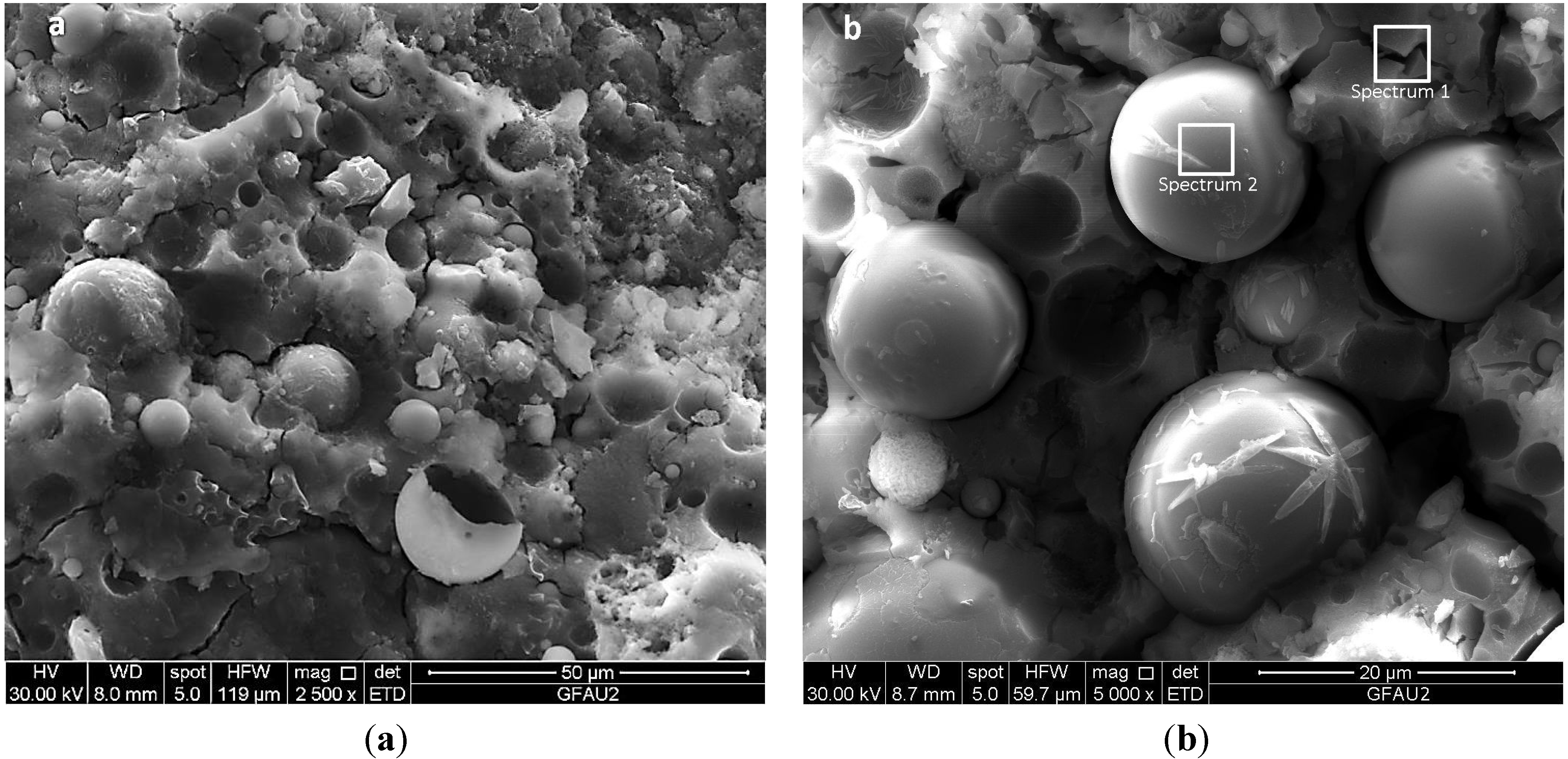 In order to assess the correct development of the geopolymerization process, 28 days cured specimens were analyzed by Scanning Electron Microscopy (SEM) and Energy Dispersive Spectroscopy (EDS) elemental analysis. SEM micrographs reported in Figure 2 refer to the binder matrix and show a typical fly ash based geopolymer microstructure [51]. A cementitious matrix constituted by the reaction products between the sodium silicate solution and the alumino-silicate precursors can be observed from the figure, and its chemical composition, as derived from the elemental analysis, is reported in Table 3. Several unreacted fly ash particles are observed to coexist with reaction products and with a few particles attacked by the alkaline solution but which maintain their spherical shape. The chemical composition of the spherical fly ash particles, as derived from the elemental analysis, is reported in Table 4. It may be noticed the higher percentage of sodium in the spectrum 1, arising from the polycondensation reaction involving fly ash and sodium silicate solution.