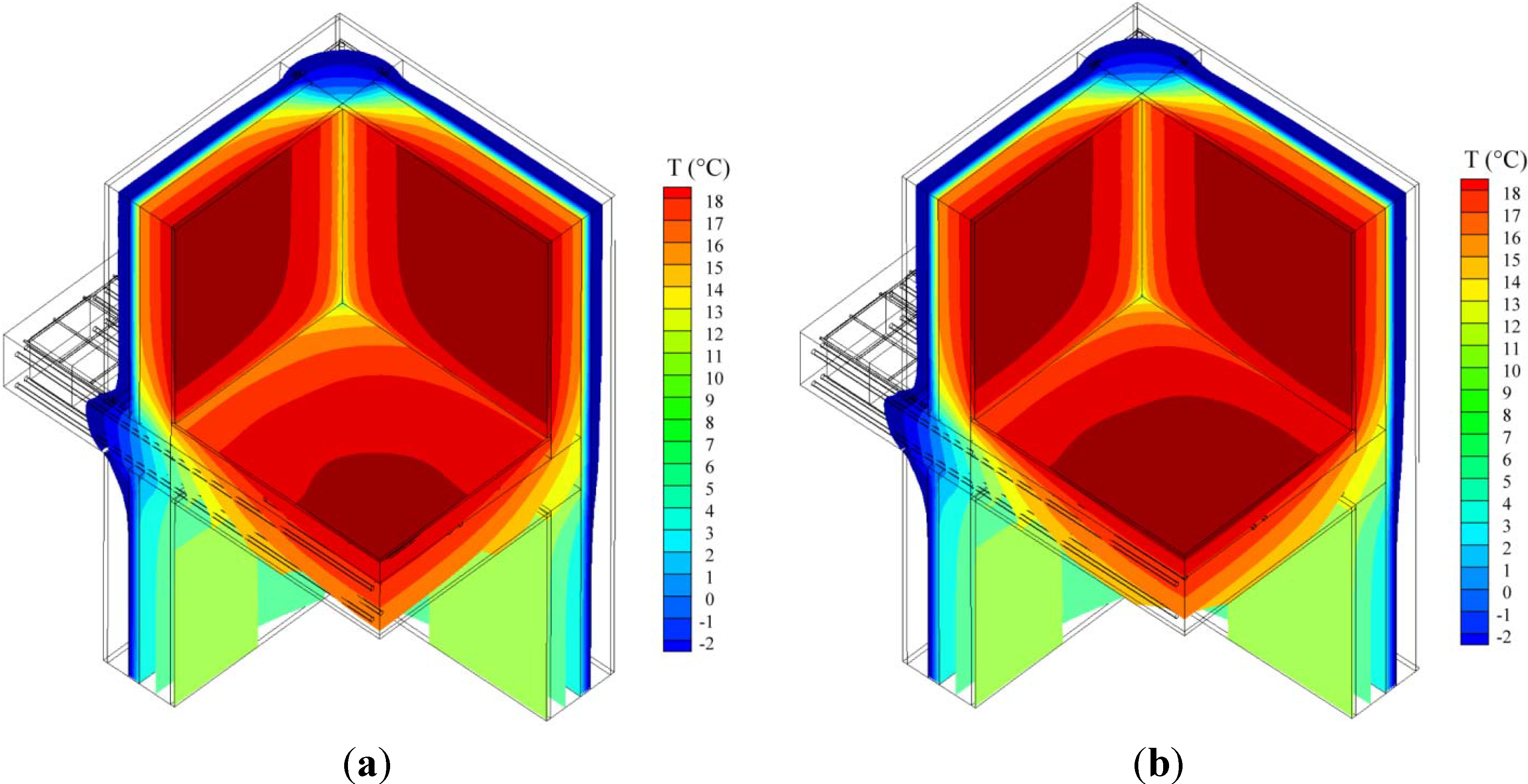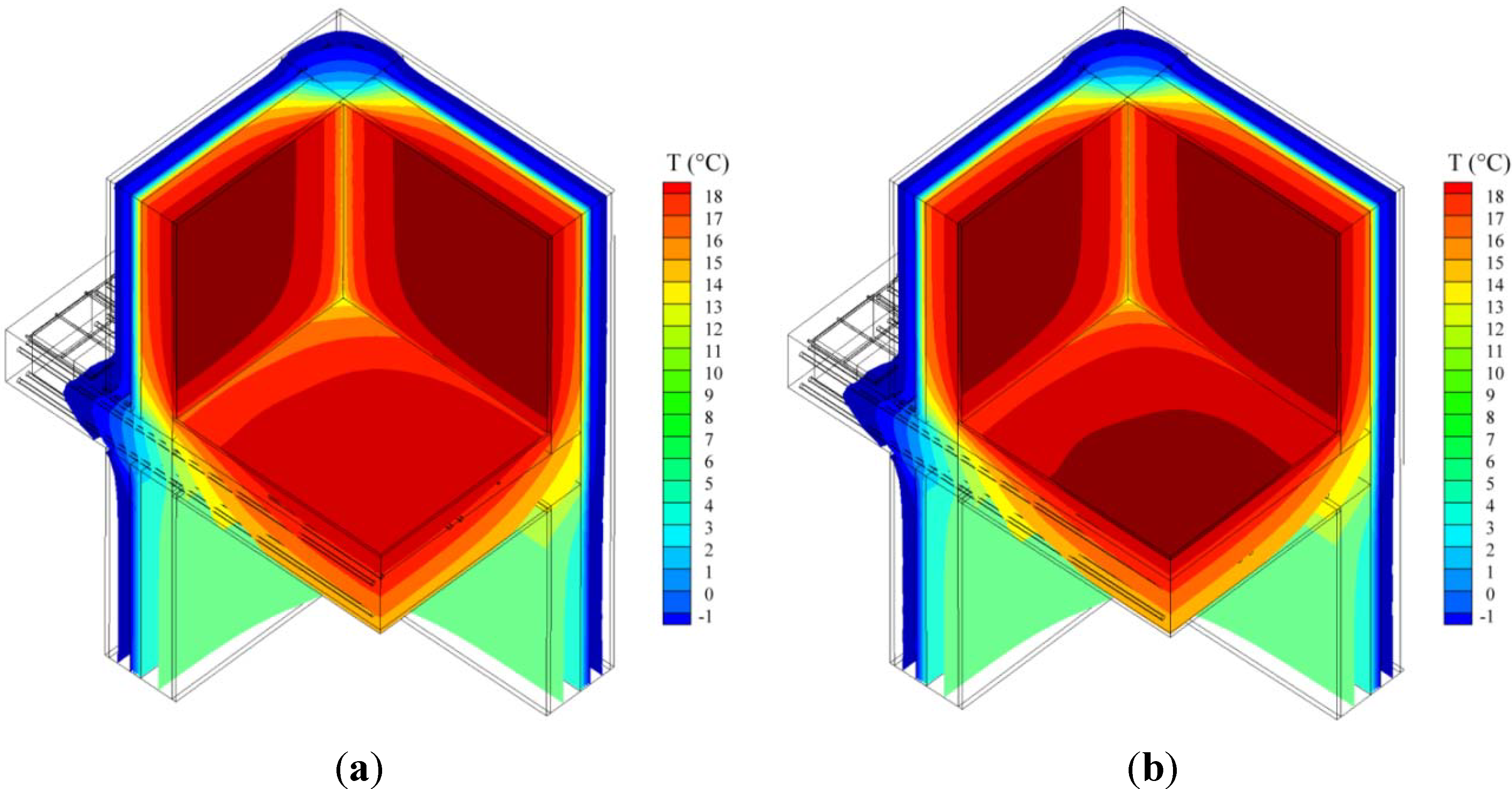 where T0 and pv,0 are the initial temperature and partial pressure of vapor, respectively, hc,i and hc,e are the convective heat transfer coefficients of the interior and exterior environment, respectively, T∞,i and T∞,e are the interior and exterior environment temperatures, respectively, TP,i and TP,e are the temperatures of the interior and exterior surfaces, respectively, pv,i pv,e are the partial pressures of vapor in the interior and exterior environment, respectively. The simple mathematical model described above is solved by using the well known Finite Element Method [53,54].