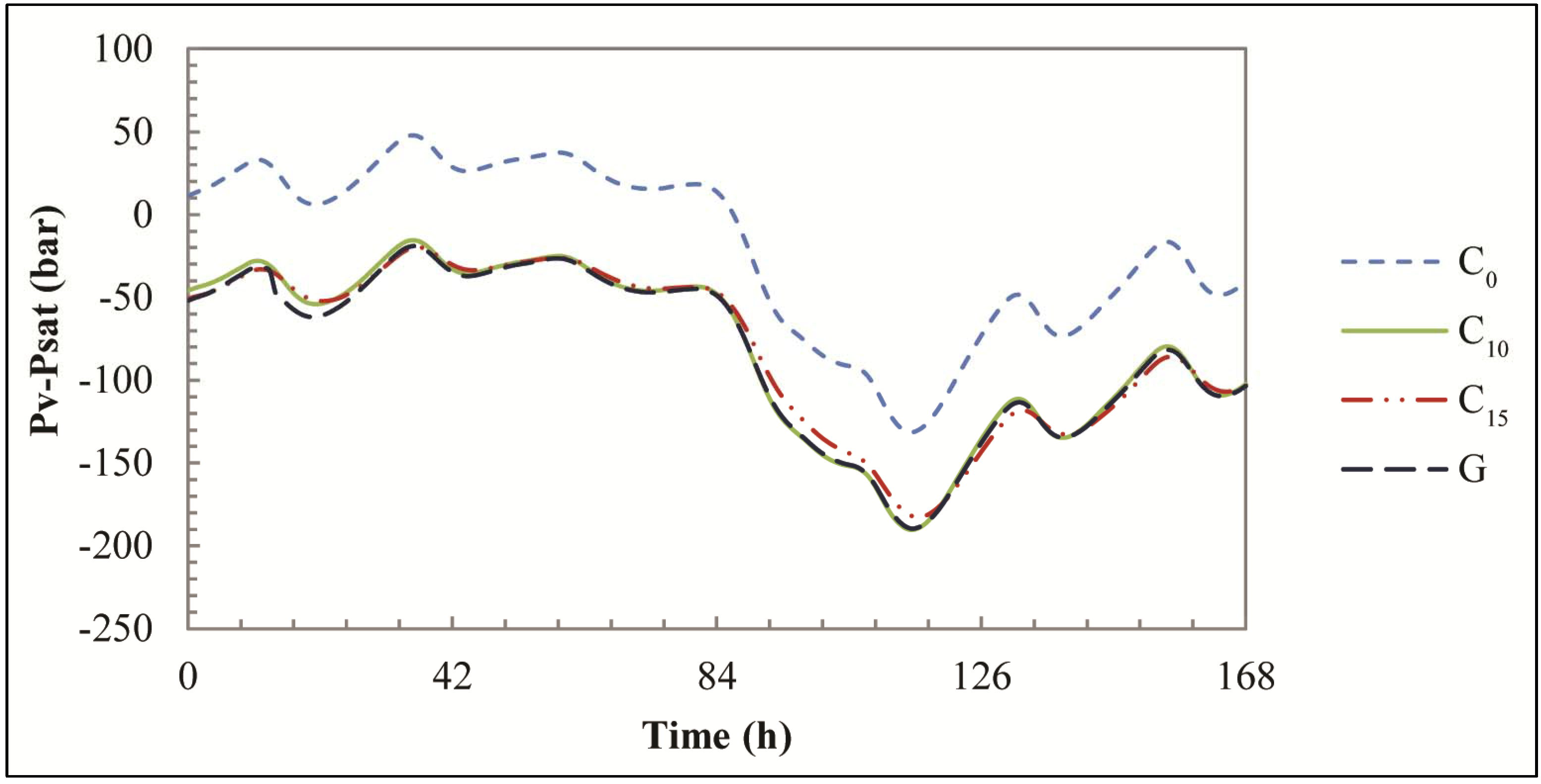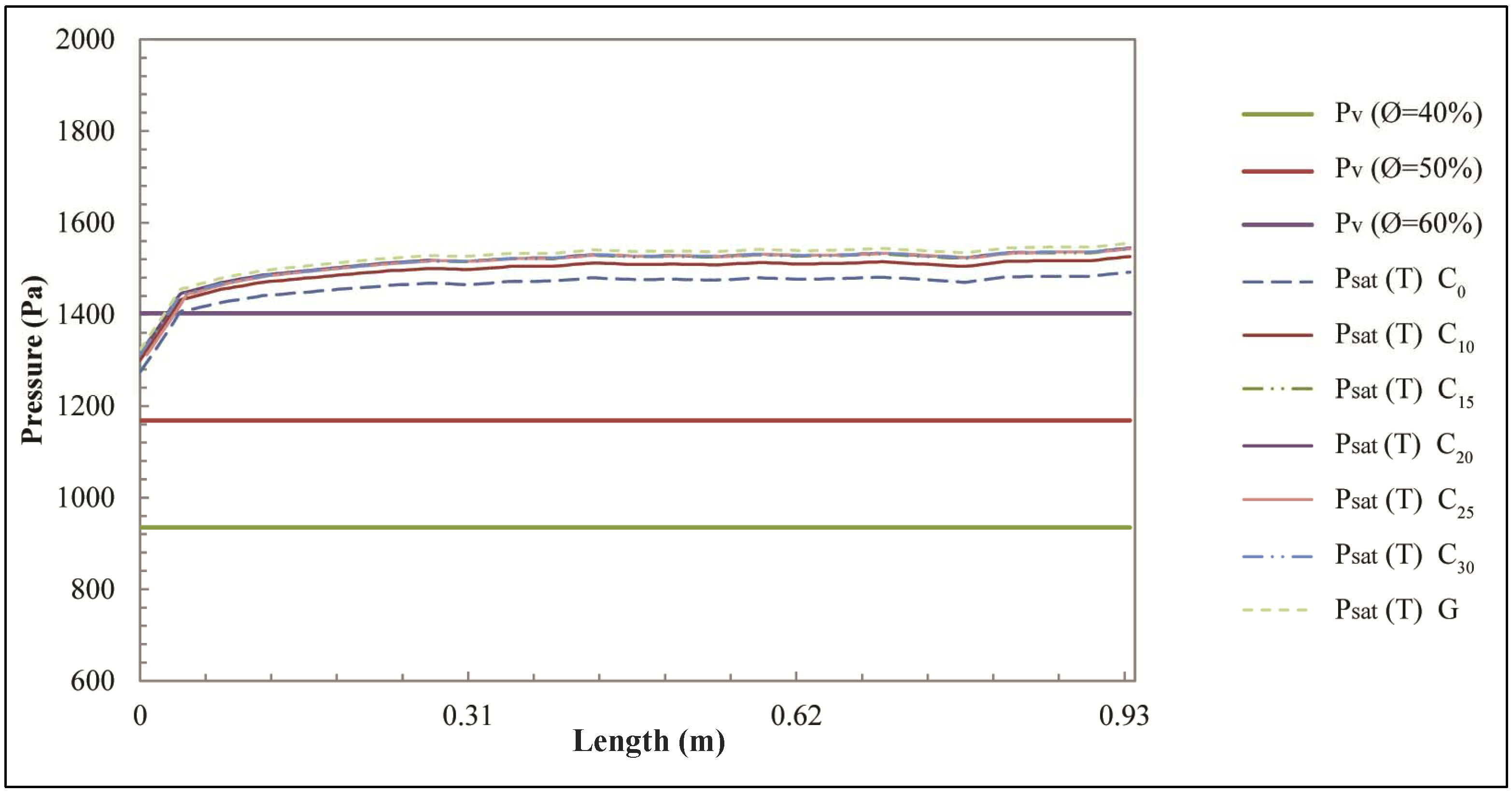 In common practice, the conditions characterized by a partial pressure of vapor, pv, larger than saturation pressure of water at a prescribed temperature, psat(T), are not physical, since the saturation pressure is the maximum pressure compatible at that prescribed temperature value. Therefore, inside the computational domain, wherever [pv − psat(T)] ≥ 0, condensation is occurring.