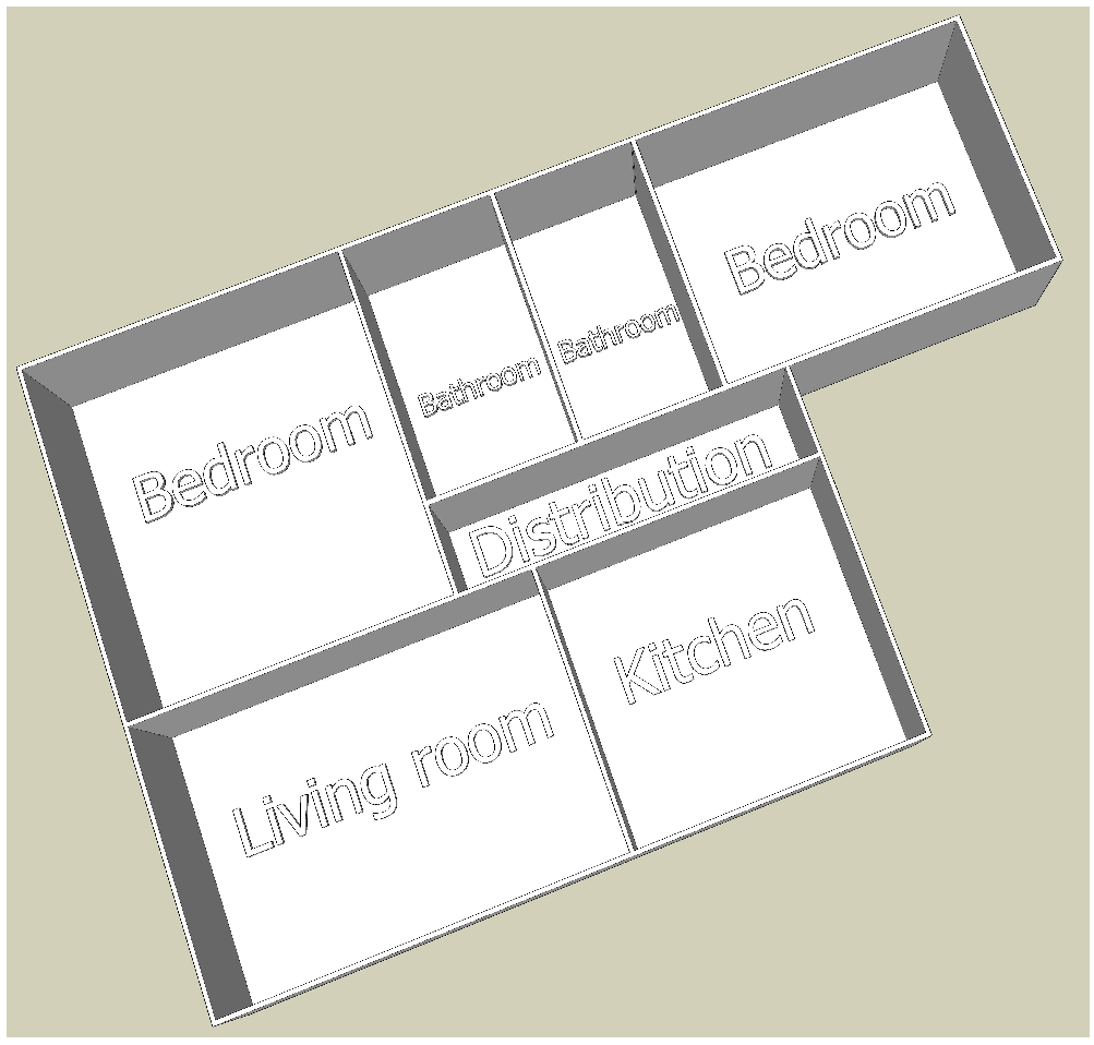 Residential buildings are characterized by rooms with different functions, different usage times and different appliances; in SIA 2024 [33] we can find specific data for the various dwelling zones (such as kitchen and bedroom/living room). Therefore, a typical Italian dwelling was defined in terms of average floor area and number of rooms, according to available national statistics [25]. The resulting unit has a floor area of 94.5 m2 (Figure 1), and is characterized by four main rooms (a 10 m2 kitchen, a 20 m2 living room and two 20 m2 bedrooms) and three service rooms (such as bathrooms and distribution for a total area of 24.5 m2).
