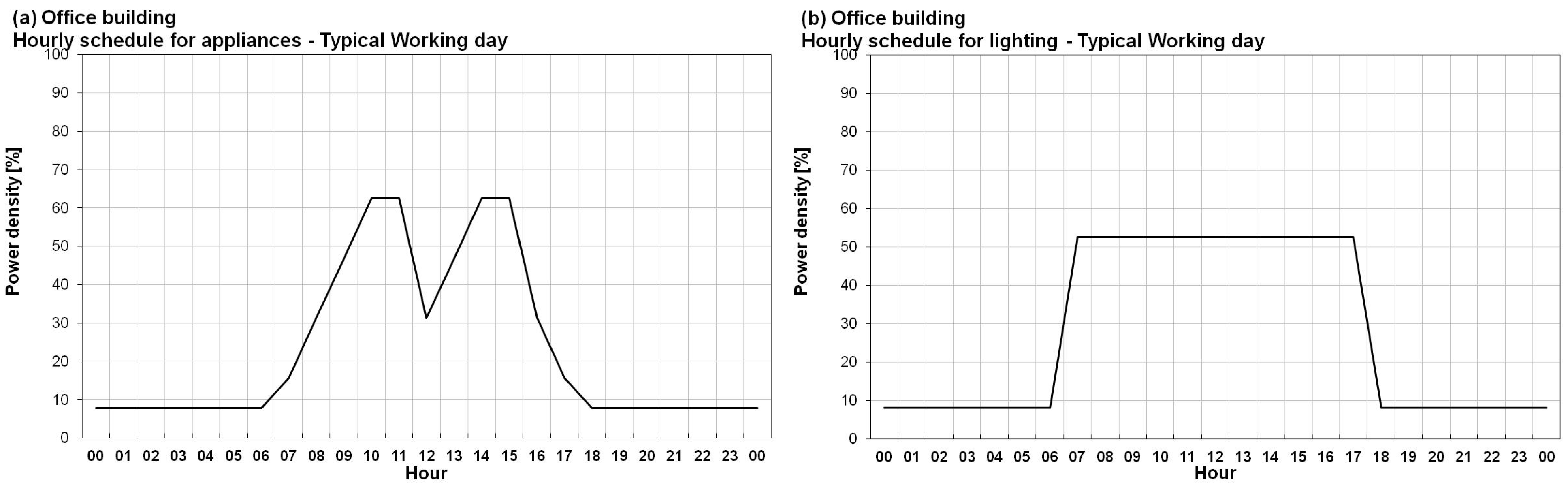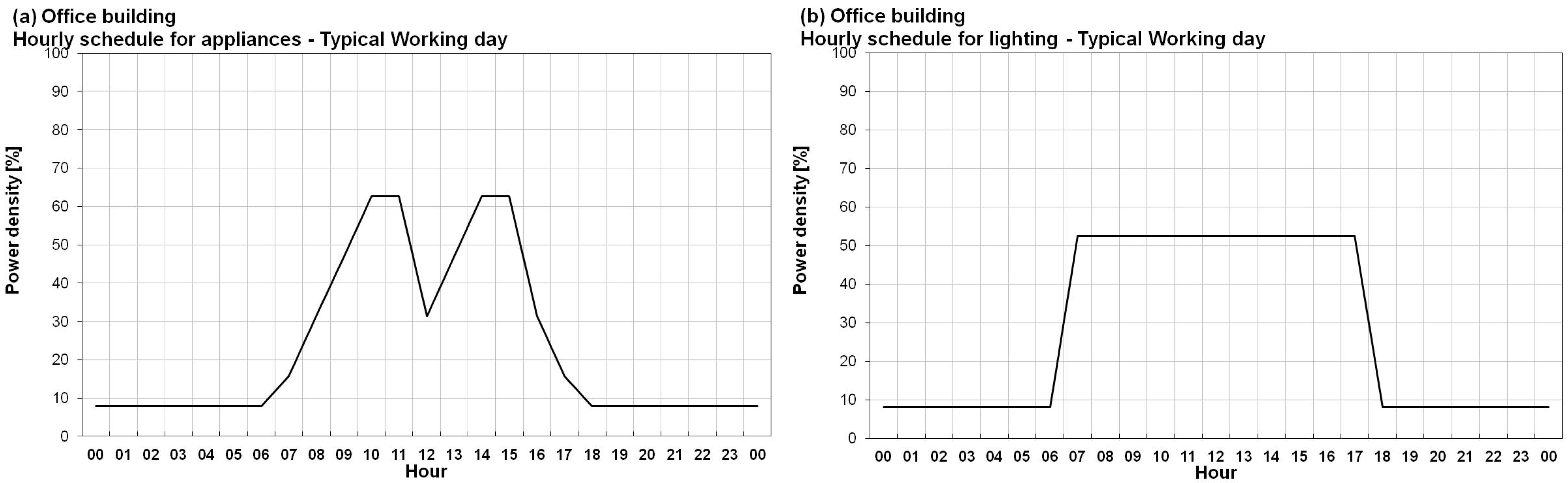 Hourly schedules for (a) appliances and (b) lighting use in office buildings: focus on typical working day.