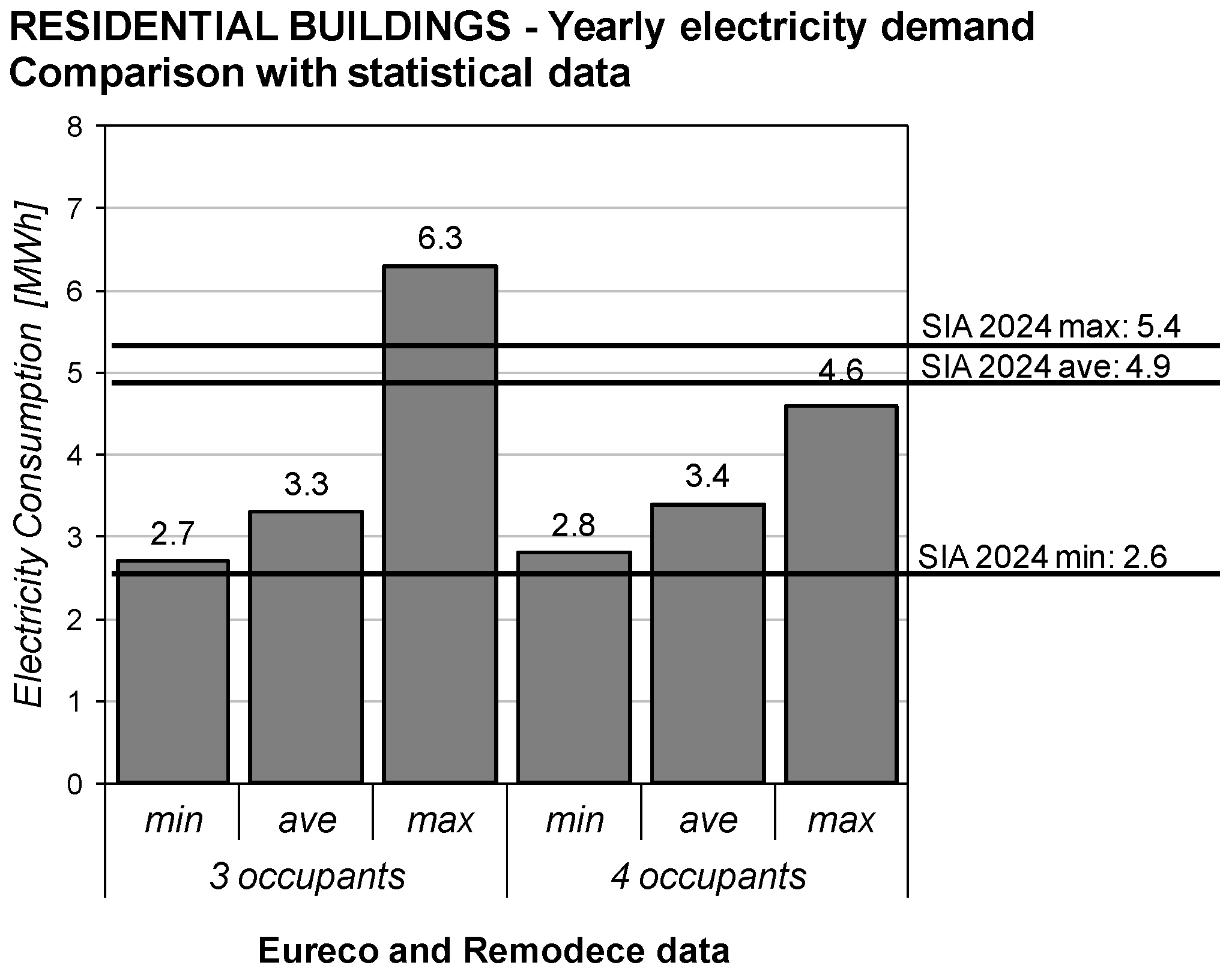 Figure 4 shows the comparison, sorted by number of occupants and by presence of electrical devices (minimum, average and maximum). It can be seen that most of the surveyed building typologies (except for three occupants homes with the highest number of installed appliances) are characterized by an electricity demand that remains between the minimum and the average values derived for the typical dwelling following the indications reported in (SIA 2024 [33]).
