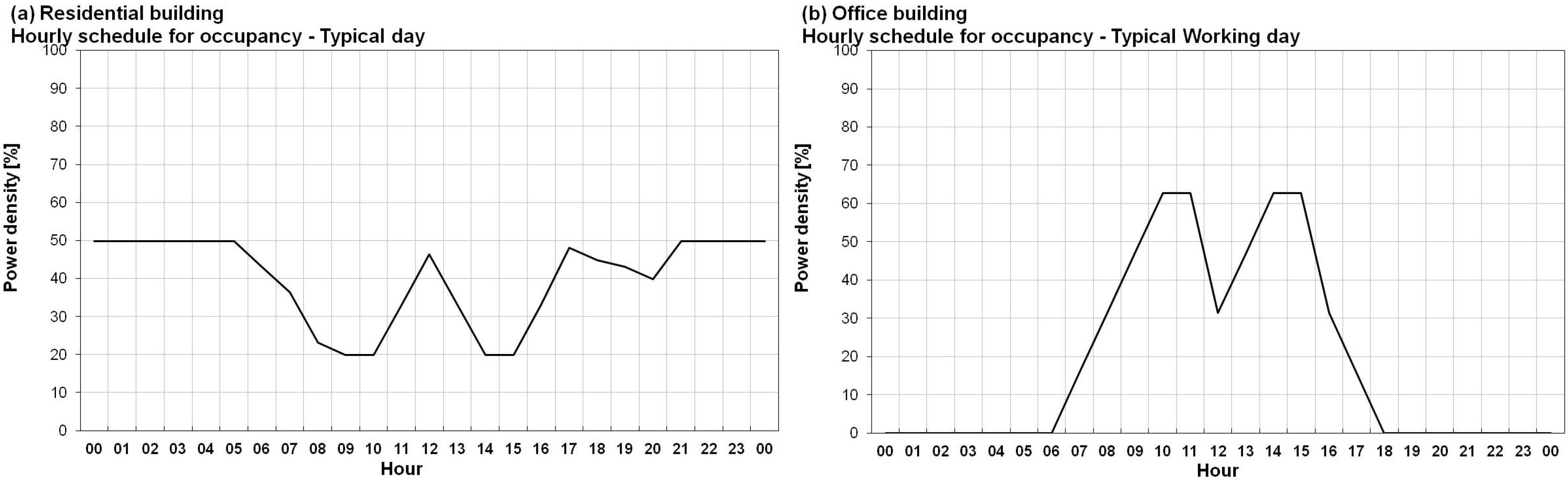 The specific hourly occupancy schedule for a typical day of a residential building and for a typical working day of an office building are described in Figure 6, respectively.
