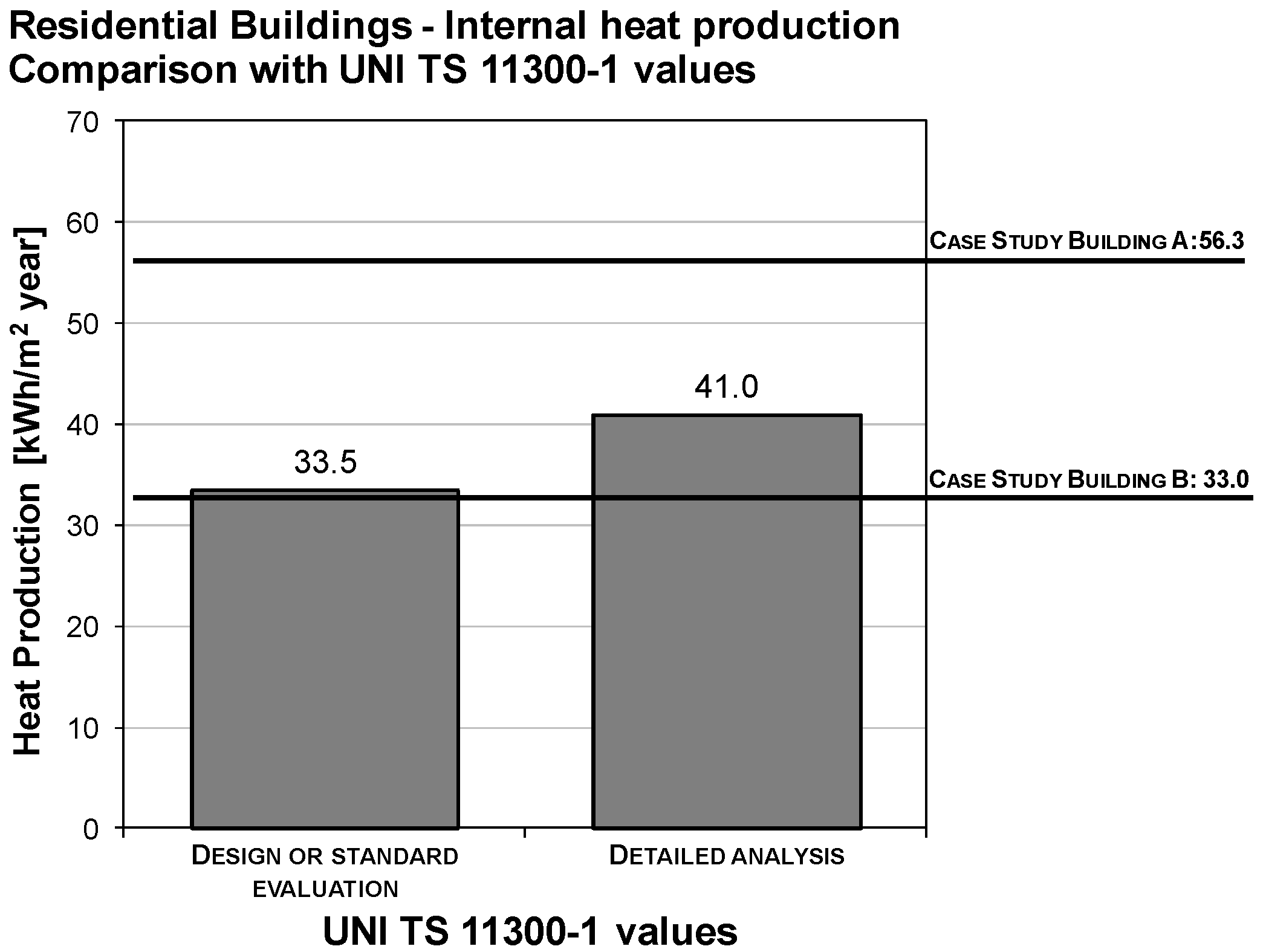 Comparison of the yearly internal heat production for Buildings A and B calculated by TRNSYS and the data from UNI TS 11300-1 [32], in kW h/m2.