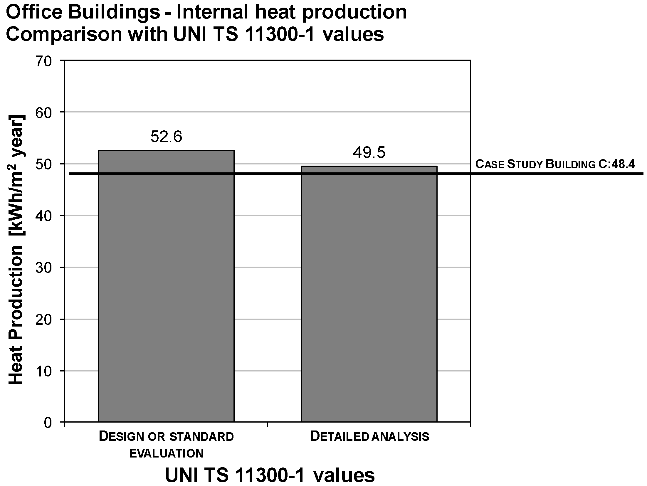 The contribution of the internal gains to the resulting buildings’ heating and cooling demands are analyzed in detail in the previous works by the authors [10,11]. This contribution varies in accordance with the overall yearly internal heat production, with Building A as the less affected by the gains and Building B as the most affected one, and can constitute a significant portion of the overall climatization demand (between 10% and 60% for heating and between 50% and 80% for cooling).