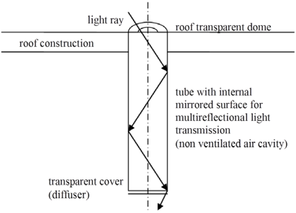 Tubular light guides have been the subject of increased professional interest since at least the mid-1980s [5]. The guide light transmittance has been studied in experimental and theoretical models [6,7]. Computer simulations focused on thermal and air flow profiles of a special light guide system composed of two concentric tubes which combine daylighting and ventilation functions were run [8,9,10]. In a double shell light guide model for light/vent pipes, both stack and external wind effects were studied [11,12]. Specific studies on rectangular light guide ducts integrated with ventilation systems and solar water heaters [13] and a computer fluid dynamic (CFD) model of internal helically finned tubes for parabolic trough design by CFD tools [14] were also published.