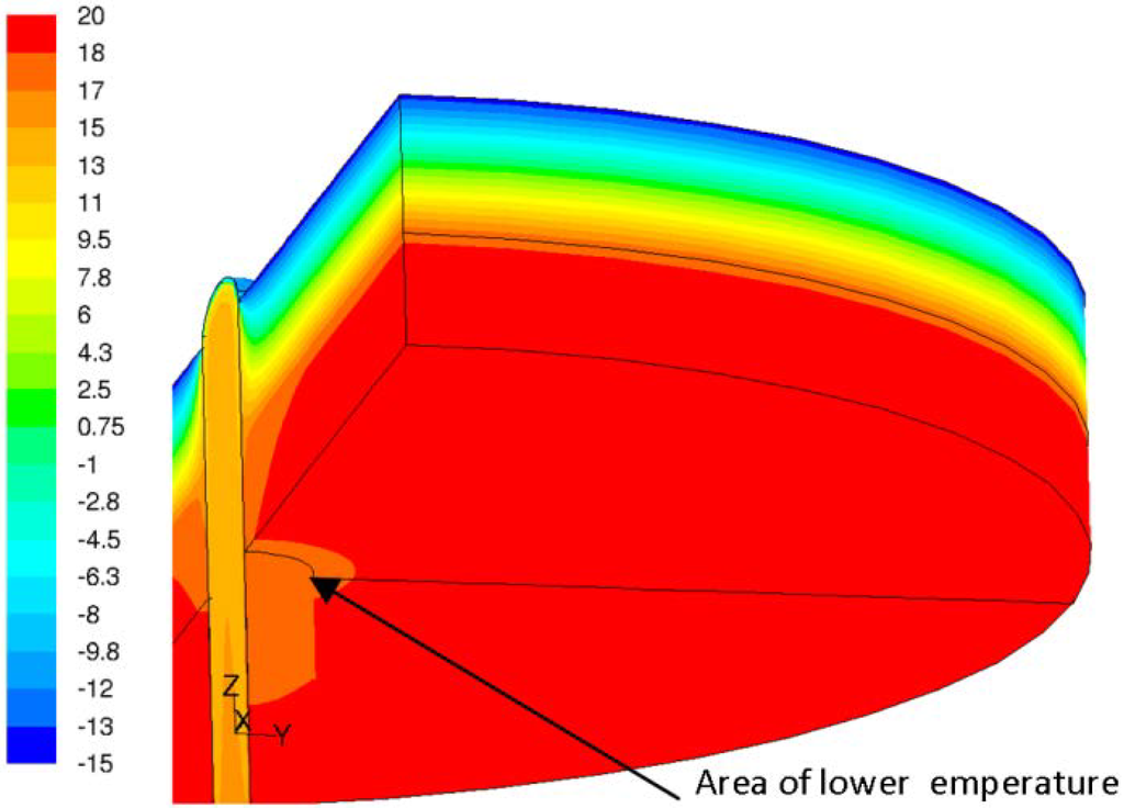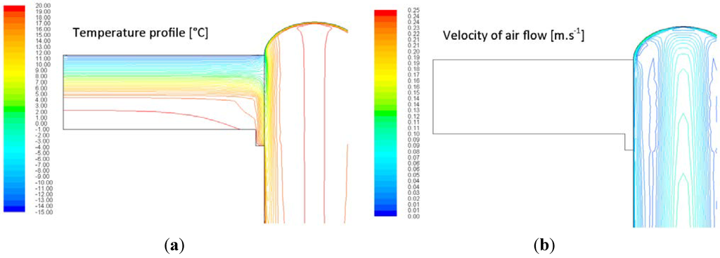 The minimal temperature on internal surface of the simulated segment is very important for specification of thermal bridges and places with potential condensation risks (Figure 16 and Figure 17).