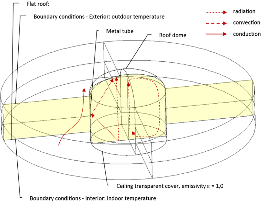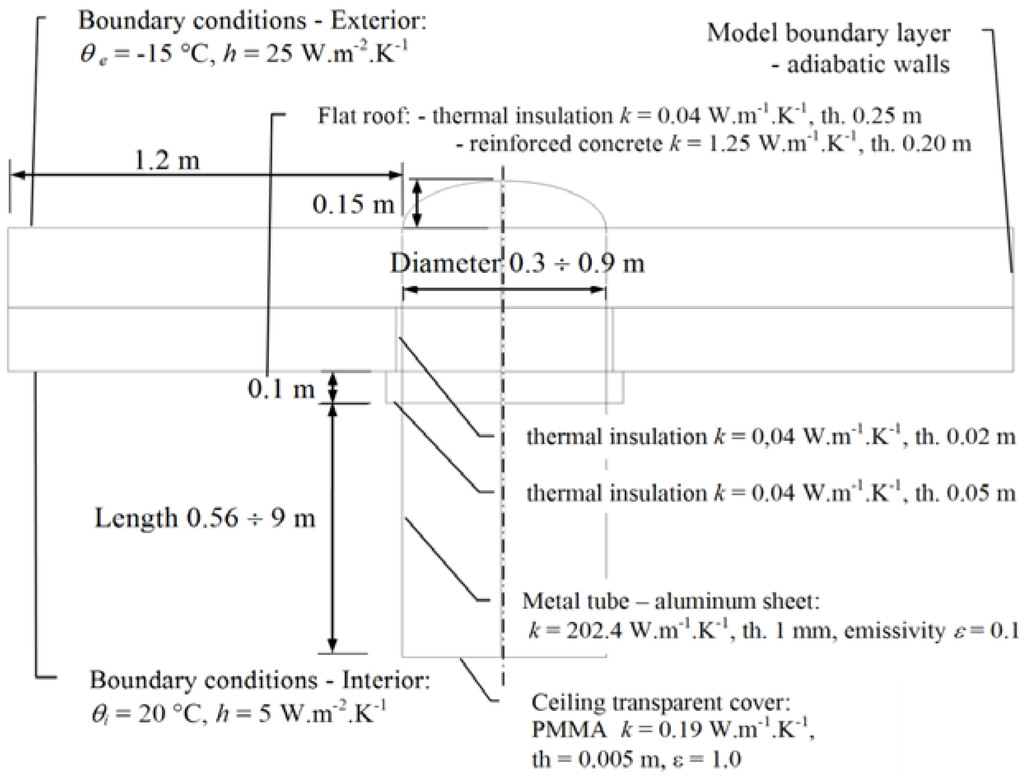 This article is aimed at the thermal evaluation of common tubular light guides that serve for daylighting without the ventilation effect, as shown in Figure 1. The thermal properties of light pipes were noted in [15,16]. Installation of the light guides in insulated roofs could produce thermal bridges and water vapour condensation problems. These problems depend on many factors, but mainly on the hydrothermal properties of materials and on indoor and outdoor air temperatures and relative humidity. Building construction thermal bridging has been topic of many investigations [17,18,19] but the common tubular light guides have not been studied in detail in terms of temperature and air flow profiles.