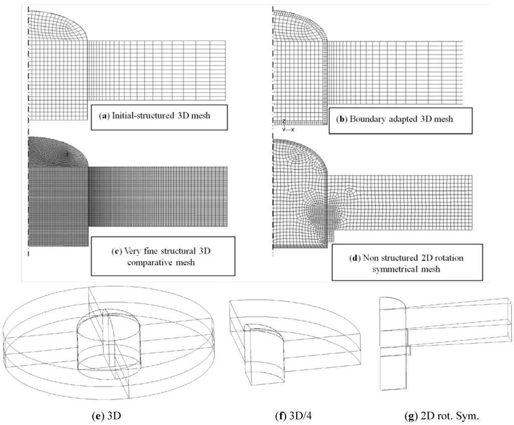 Meshes and geometric types: (a) Initial-structured 3D mesh; (b) boundary adapted 3D mesh; (c) Very fine structural 3D comparative mesh; (d) Non structured 2D rotation symmetrical mesh. Scheme of the geometric models considered; (e) 3D-cylinder; (f) 3D/4-quadrant; (g) 2D rotation symmetrical segment.