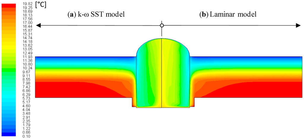 The SST model is an advanced turbulence model. It is a hybrid version of the k−ε model and k–ω models. It combines the k−ω model for the near wall region and the k−ε model in the outer region. This means that the model reduces the deficiency of the k−ω model in the outer region [28]. The laminar and turbulent (SST) models were compared for the tested tubular light guide simulation.