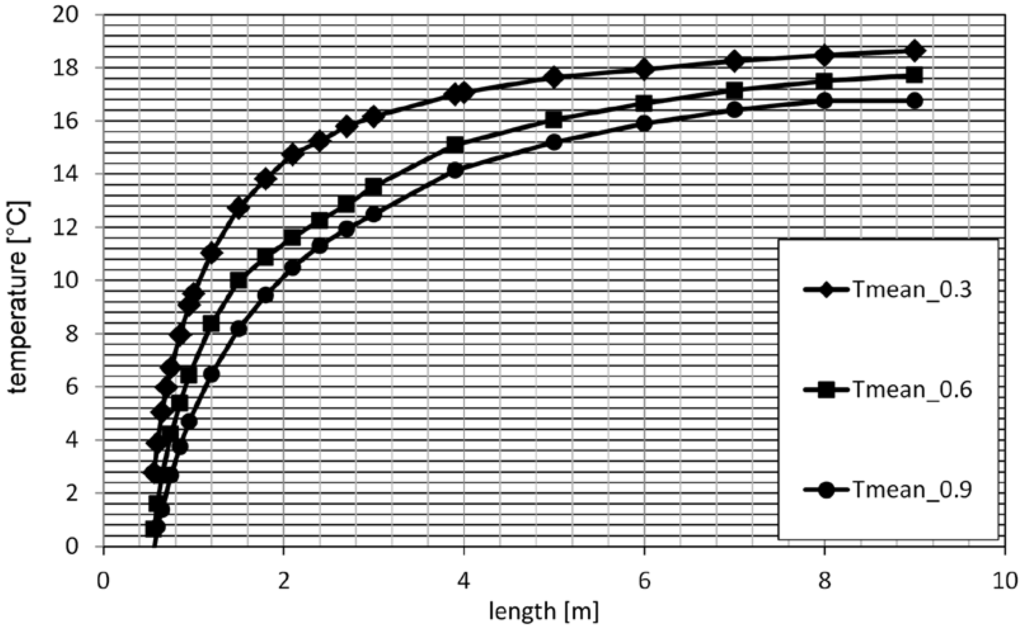 Mean temperatures in the light guide tubes of diameters 0.3 m, 0.6 m and 0.9 m and lengths from 0.56 m to 9 m are presented in Figure 11. The mean temperature is higher for light guides of smaller diameters and longer tubes. It means the air temperature in the closed cavity of the tubular light guide increases with length and decreases in wider and shorter profiles.