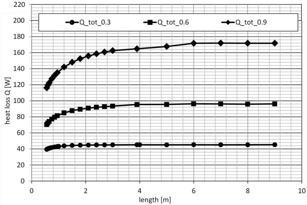 Heat losses of tubes of diameters d = 0.3 m (Q_tot_0.3), 0.6 m (Q_tot_0.6) and 0.9 m (Q_tot_0.9) and lengths l = 0.56 m to 9 m.