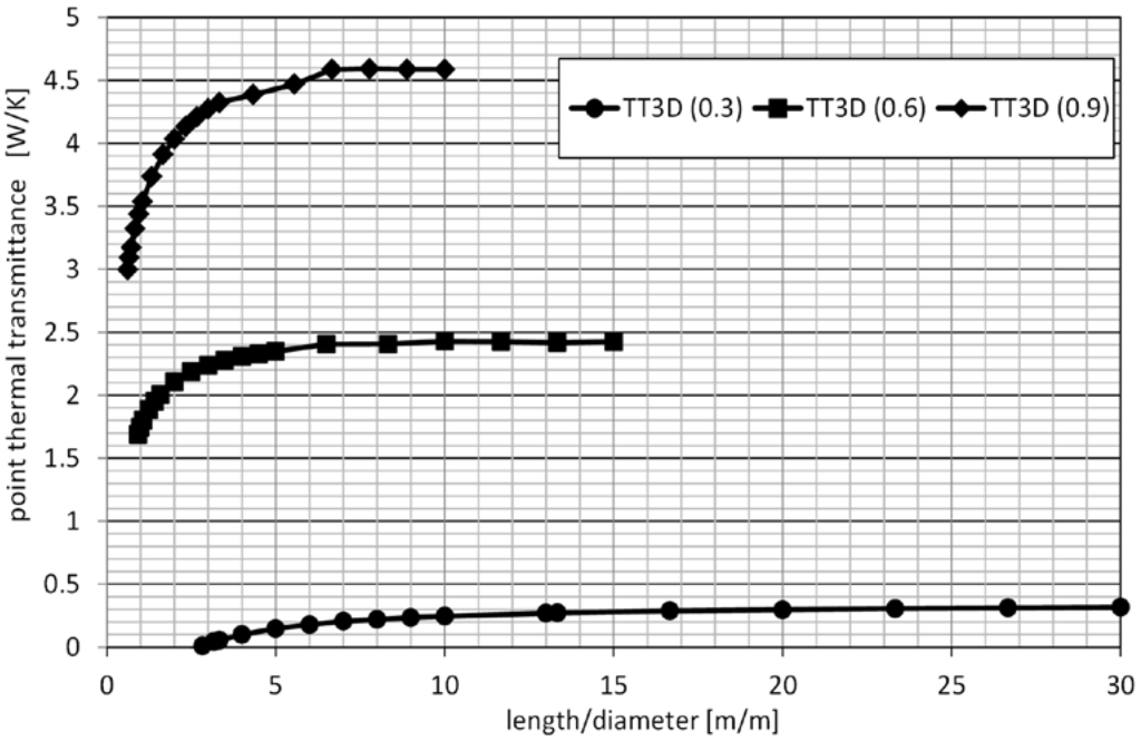 Point thermal transmittance in dependence on the tubular light guide aspect ratio (length/diameter); the tubular light guides of diameters d = 0.3 m—TT3D (0.3), d = 0.6 m—TT3D (0.6) and d = 0.9 m—TT3D (0.9).