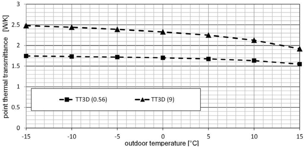 The point thermal transmittance was also calculated for different outdoor temperatures within interval −15 °C and +15 °C, Figure 14.