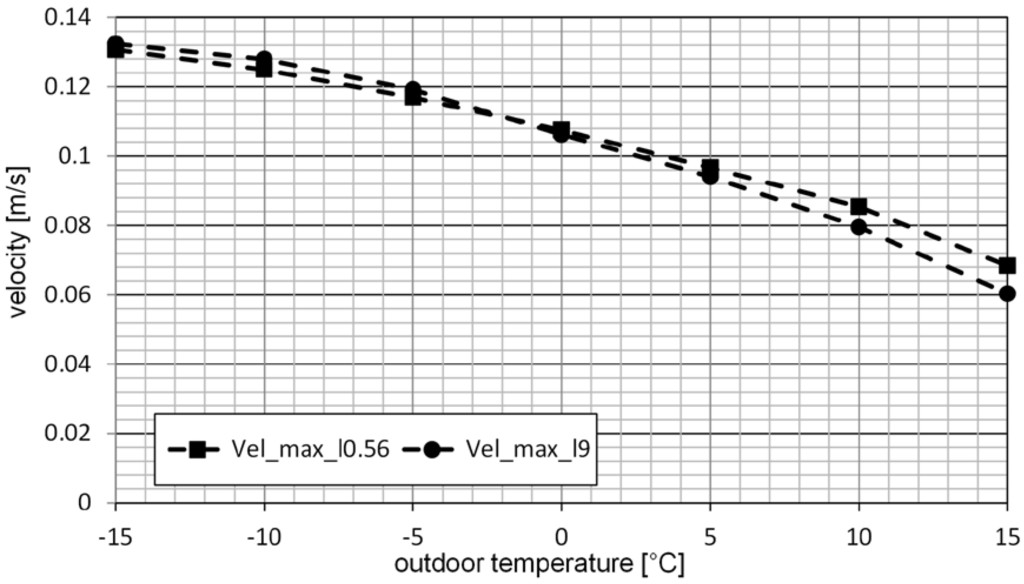 Maximal air flow velocity in tubular light guides d = 0.6 m, l = 9 m (Vel_max_l0.56) and d = 0.6 m, l = 0.56 m (Vel_max_l9), dependence on the outdoor temperature between −15 °C and +15 °C.