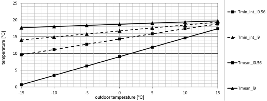 - Outdoor temperature interval is set to −15 °C and +15 °C to correspond with the winter and spring/autumn seasons of the temperate climate of the Central Europe region;