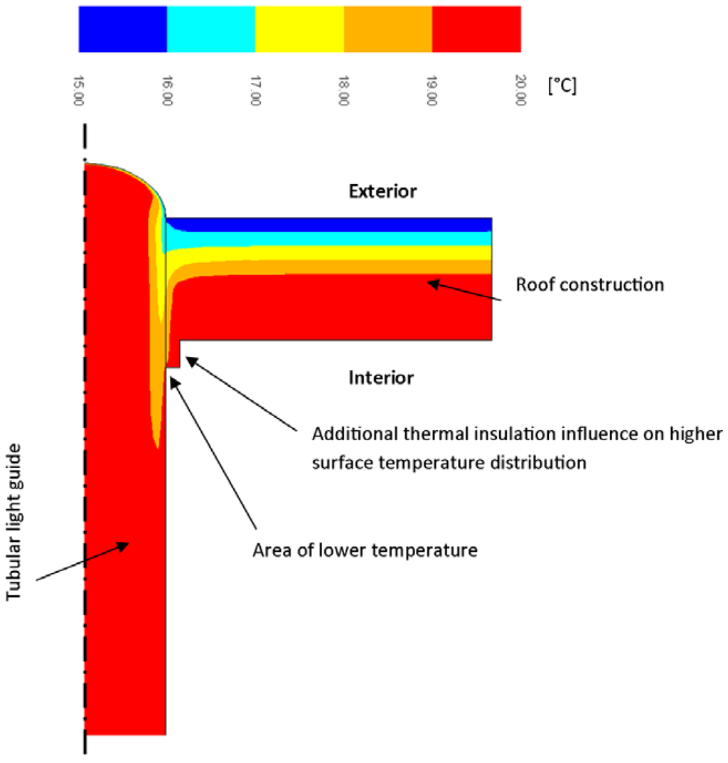 The evaluation of tubular light guides (TLG) as point thermal bridges and their influence on the heat loss of a common room was considered. Results were calculated for an outdoor temperature of −15 °C and indoor temperature +20 °C. The room is located inside a building among other rooms with identical thermal climate; only the heat transmission loss of a roof was considered. The heat loss of the roof without the light guide installation is 94.7 W. The room of floor dimensions 3 m × 6 m is illuminated by the studied tubular light guides in two variations: