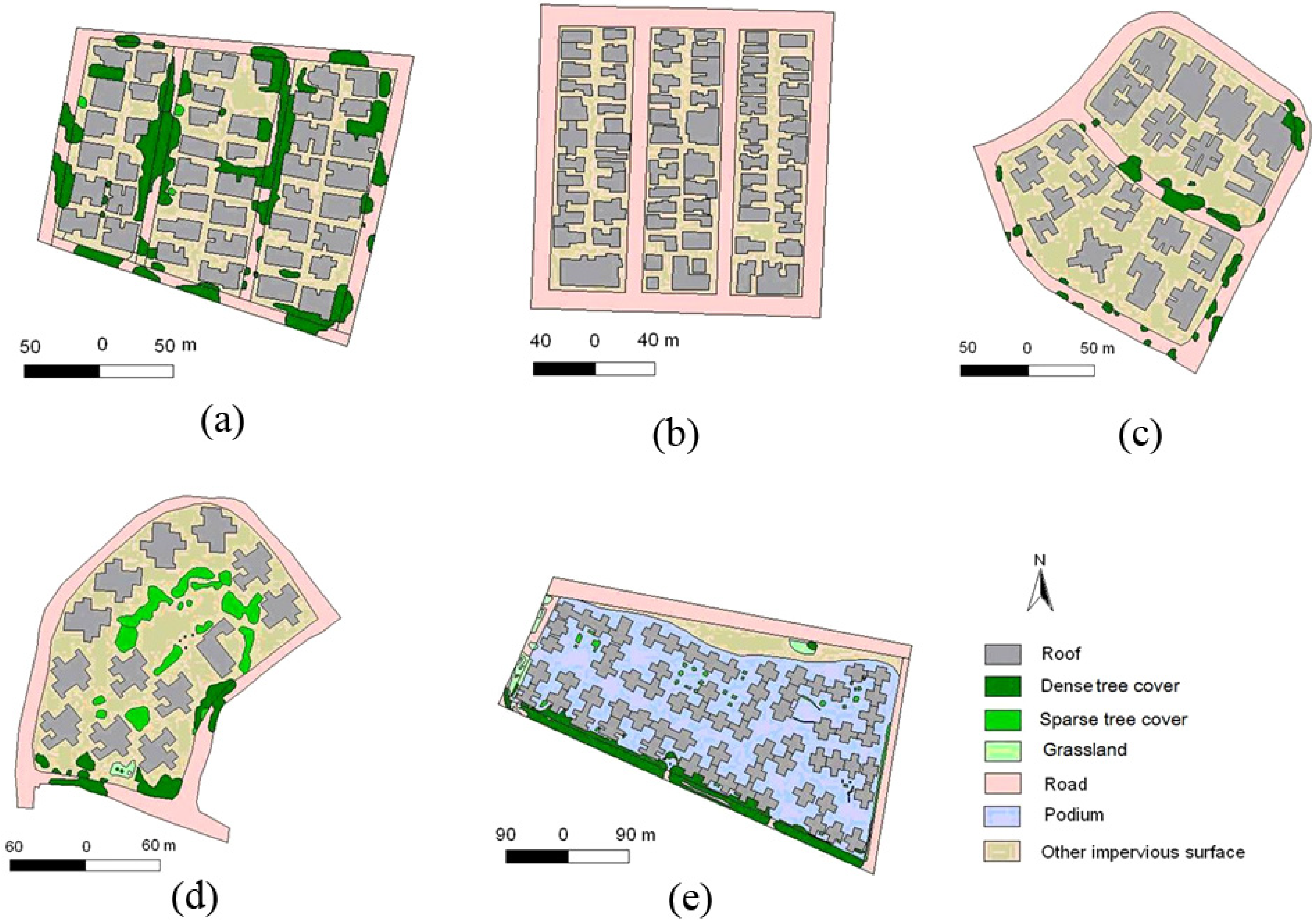 Town plan and land cover types of the five study sites (drawings a–e respectively for Kowloon Tong (KT), Kowloon City (KC), Broadcast (BC), Chun Man (CM) and Mei Foo (MF).