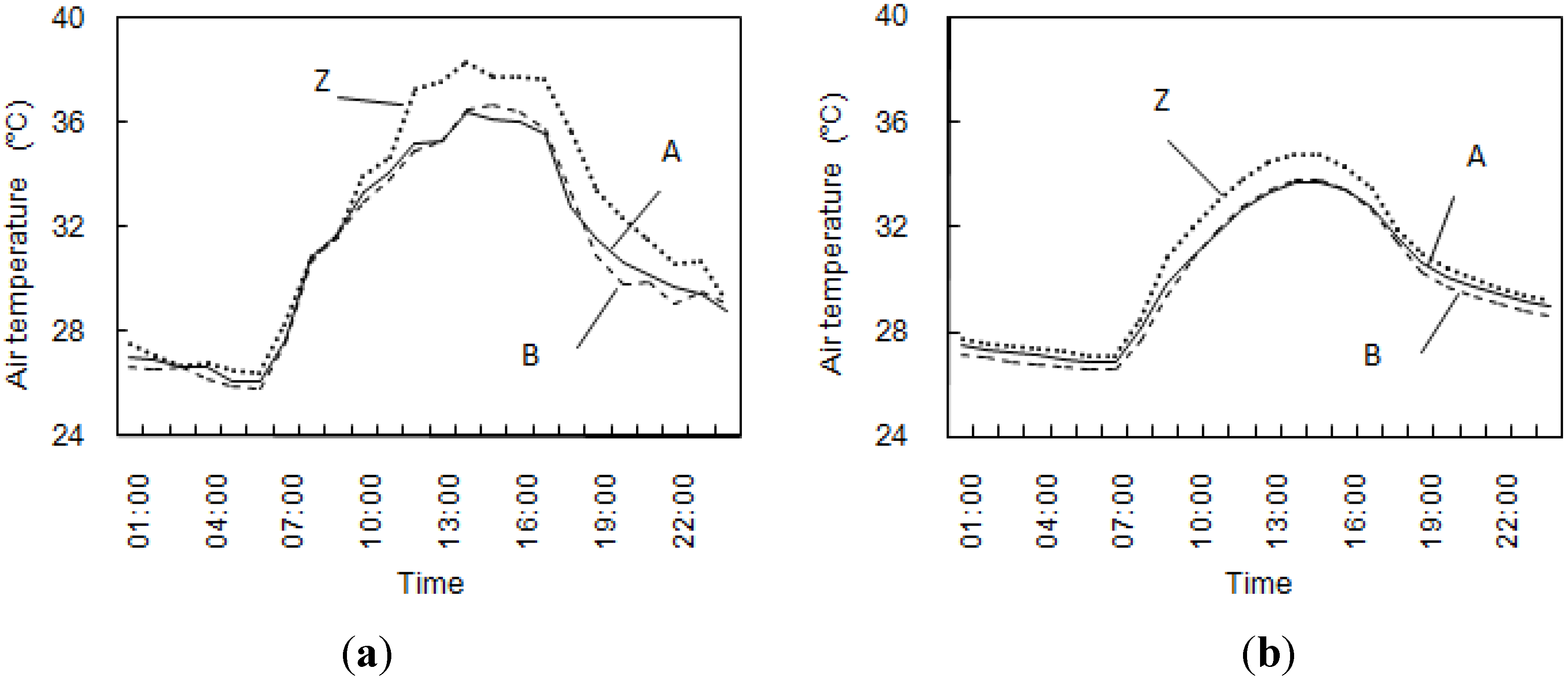 Horizontal pattern of diurnal air temperature: (a) observed; (b) simulated. (lines A, B, and Z respectively denote the two green roofs and the bare roof).