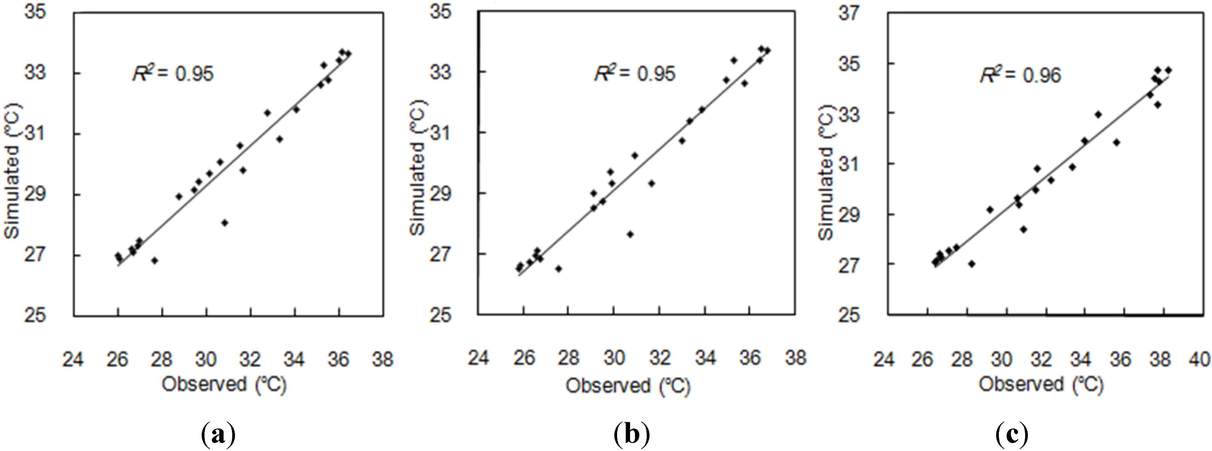 Correlations between the hourly-based observed and simulated air temperature. (a) green roof A; (b) green roof B; (c) bare roof Z.